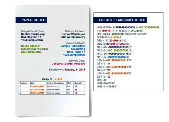 Das folgende Beispiel zeigt anhand einer Bestellung, welche Informationen aus einem papierbasierten Dokument in einer EDIFACT/EANCOM-Bestellung abgebildet werden. Zur Veranschaulichung sind die entsprechenden Informationen farblich gekennzeichnet.